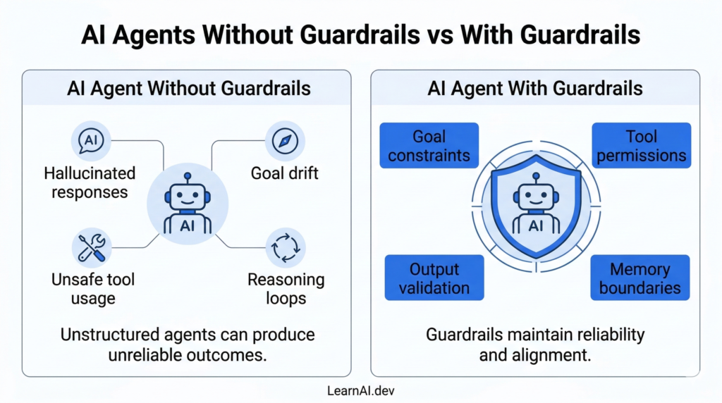 Without proper constraints, AI agents can behave unpredictably. They may hallucinate information, misuse tools, or drift away from the original goal.