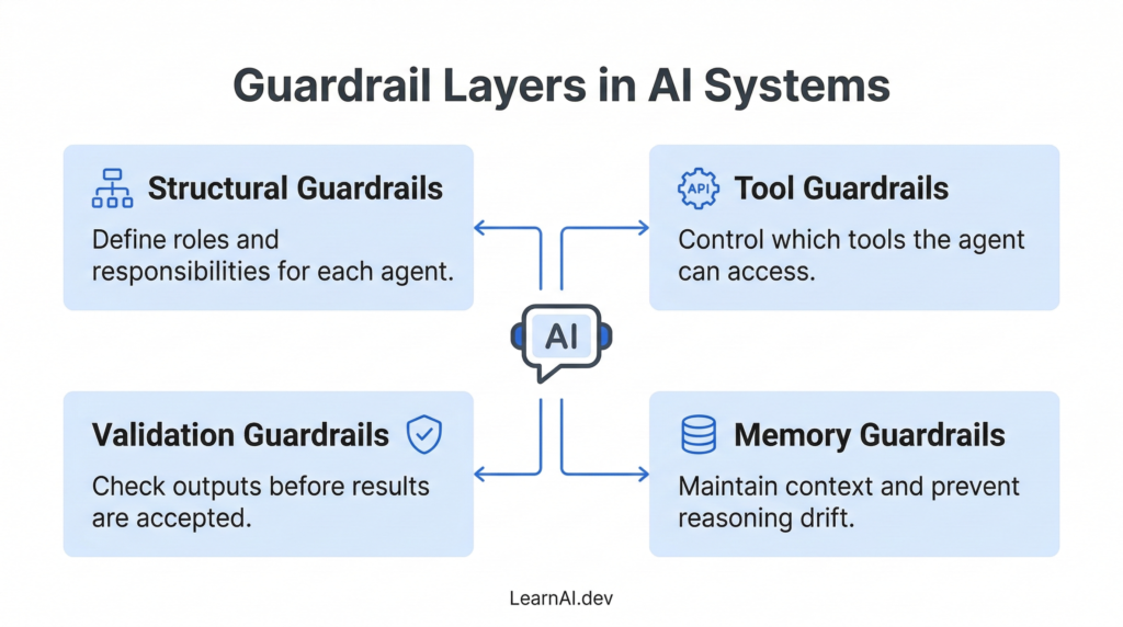 Instead of allowing an agent to operate without boundaries, guardrails ensure the system stays aligned with the intended goal.