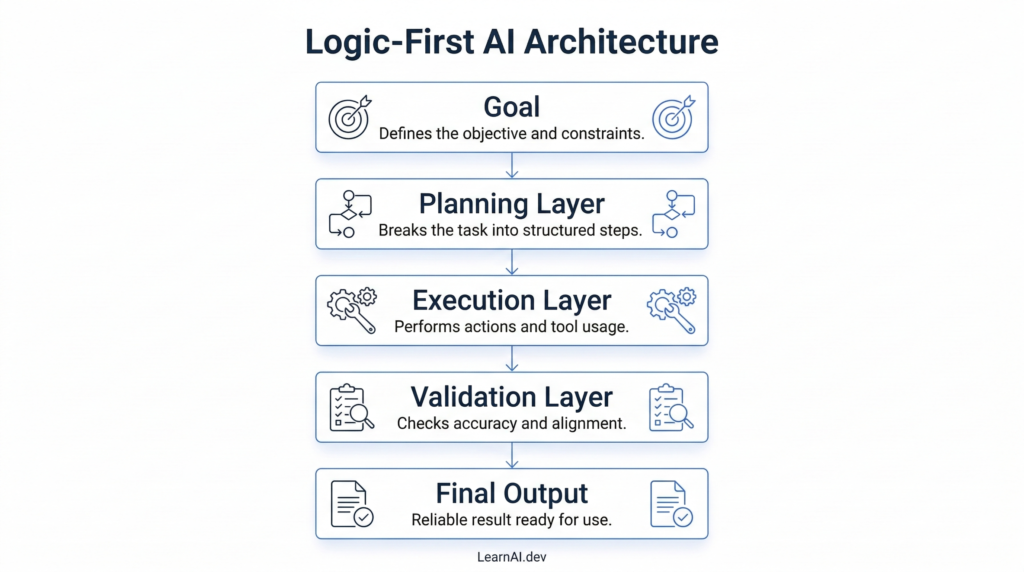 Logic-first architecture ensures that AI systems follow structured workflows rather than uncontrolled reasoning.